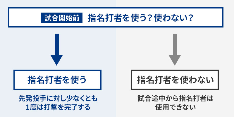チームは必ずしも投手に代わる指名打者を指名しなくても構いませんが、試合途中から指名打者を使うことはできません。