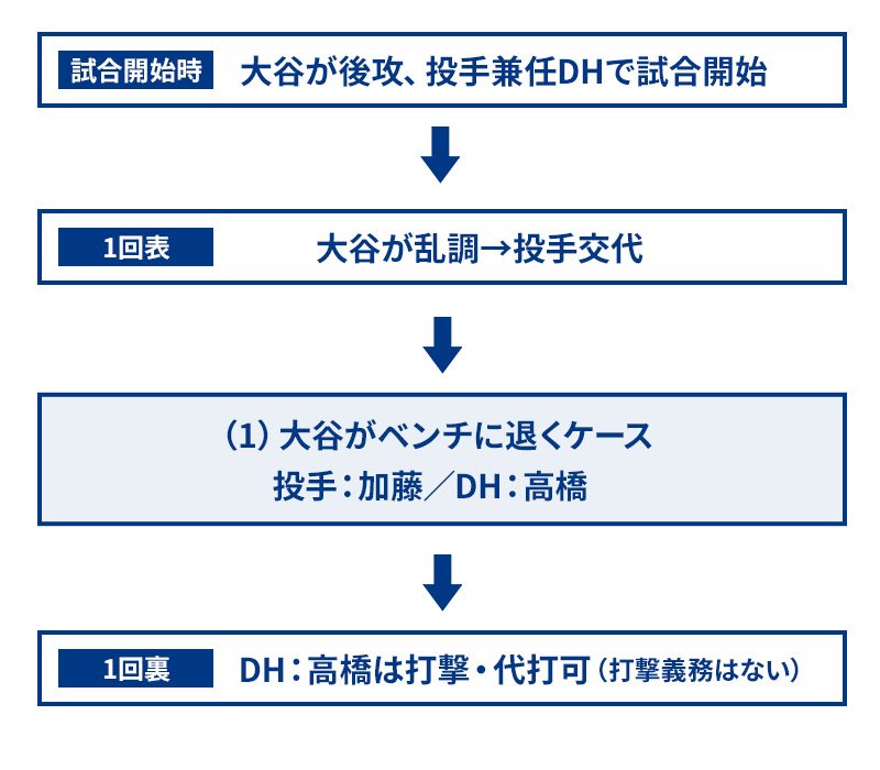 その際、指名打者消滅となり投手は退いた守備者の打順を受け継ぐ。(例2)