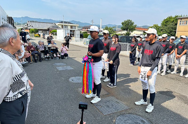 きっかけは学校のインターンシップで、野球部員が施設を訪れたことでした。その後、夏の和歌山大会の前に、利用者が千羽鶴を折ってくれるようになりました。「高校生とのふれあいが高齢者の生きがいになっている」と施設側から聞き、定期的な交流になりました。