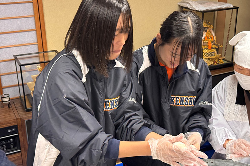差し入れを受け取った部員ら=2025年12月特別養護老人ホームなどを併設する高齢者施設の「大和桜井園」では昨年12月、部員全員で餅つきに参加しました。かけ声を掛けながら交代で杵を振り下ろし、つきあがった餅を高齢者の方々と一緒にまるめ、ぜんざいに入れてふるまいました。