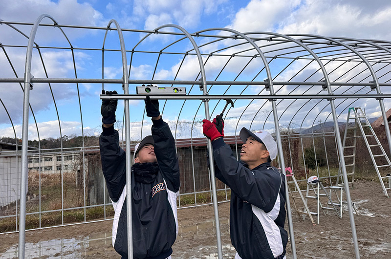 また、地域の方との交流を増やしたいと地元の桜井市に声かけしていたところ、トマトを育てるビニールハウス作りを手伝ってほしいという依頼を受けました。しゃがんだ姿勢で50cm間隔にくいを打っていくのは慣れない作業でしたが、依頼主には通常なら1週間かかる骨組みを半日で組むことができたと喜んでもらえました。