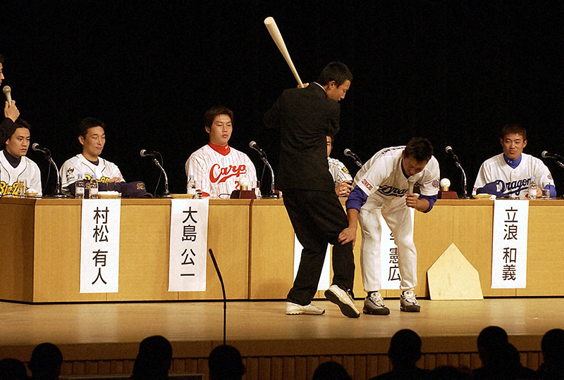 初めて開かれた「夢の向こうに」。壇上で高校生に打撃指導をする中日・立浪和義内野手=2003年12月26日、大阪市の大阪国際会議場(毎日新聞社提供)