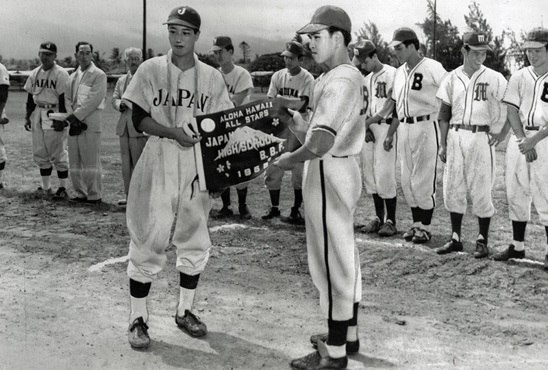 ハワイでの試合前に記念ペナントを贈る日本選抜チームの選手=1955年9月5日(朝日新聞社提供)