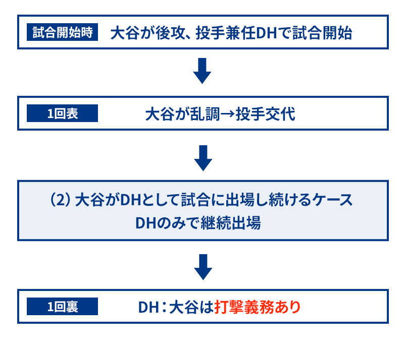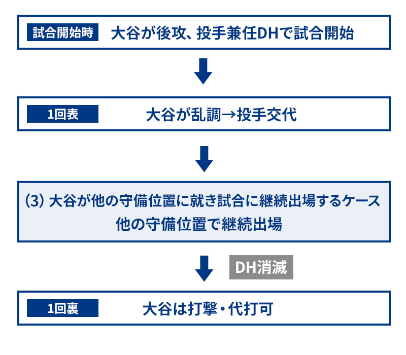 その際、指名打者消滅となり投手は退いた守備者の打順を受け継ぐ。(例2)