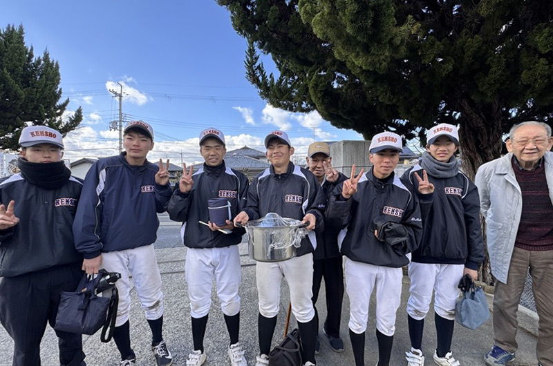 きっかけは学校のインターンシップで、野球部員が施設を訪れたことでした。その後、夏の和歌山大会の前に、利用者が千羽鶴を折ってくれるようになりました。「高校生とのふれあいが高齢者の生きがいになっている」と施設側から聞き、定期的な交流になりました。