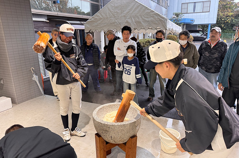 差し入れを受け取った部員ら=2025年12月特別養護老人ホームなどを併設する高齢者施設の「大和桜井園」では昨年12月、部員全員で餅つきに参加しました。かけ声を掛けながら交代で杵を振り下ろし、つきあがった餅を高齢者の方々と一緒にまるめ、ぜんざいに入れてふるまいました。
