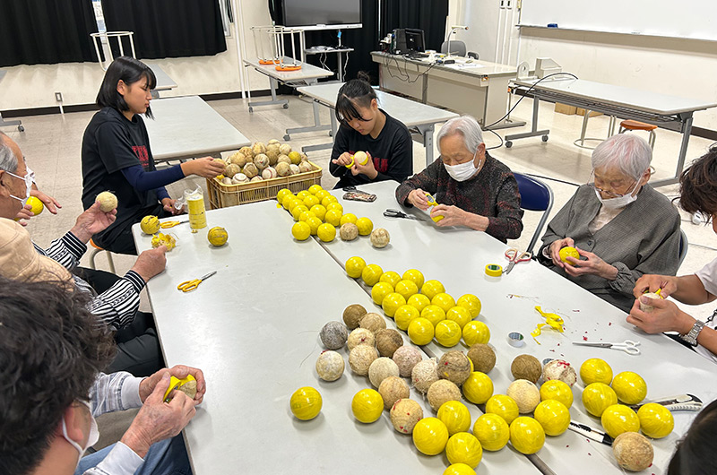 使い古したボールの皮をはぎ、黄色いテープを巻いてティー打撃用に再生する作業を一緒にしたこともあります。マネジャーの滝本心絆さん(2年)は「とても楽しそうで、一生懸命やってくださいました」と、会話も弾んで楽しめたといいます。