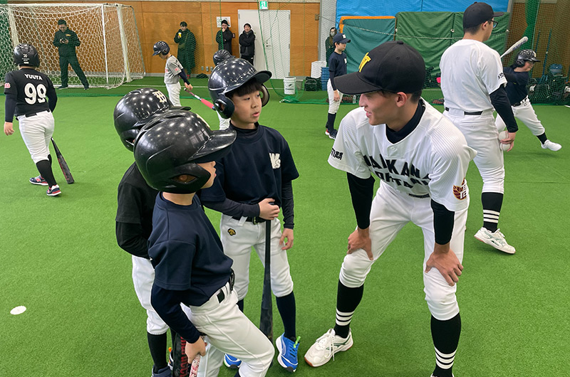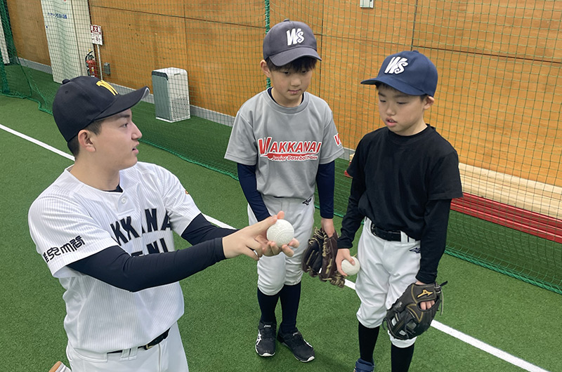 また、少年団の野球教室も行っています。一緒に練習しながら、小学生にバッティングや守備を教えています。いつもは教わる側の部員たちですが、教える側になるとどういうふうに伝えたらわかりやすいだろうということを考える必要があります。